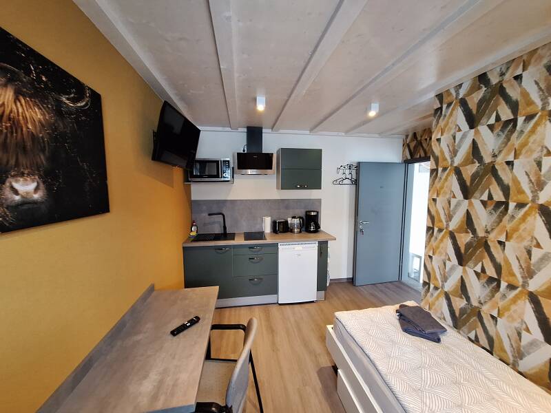 Die Unterkunft wurde im Juli 2023 für unsere Gäste neu eröffnet und ist modern und gemütlich eingerichtet. Die Zimmer haben eine Größe von 10-18m2 und ist mit 2 Einzelbetten und einer Schrankwand ausgestattet. Eine neue moderne Küche steht unseren Gästen im Zimmer zur Verfügung. Die Küche ist komplett ausgestattet mit Kühlschrank, Herd-Mikrowelle mit Backfunktion, Kaffeemaschine, Wasserkocher.